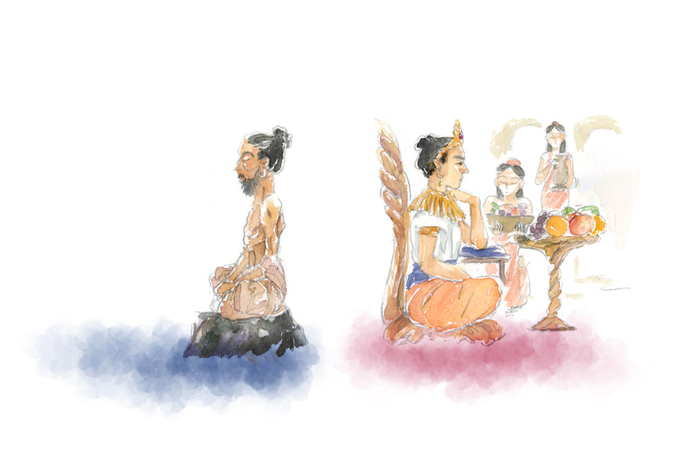 出家されたお釈迦さまは、悟りを得るための頼るべき師に出会うことができず、「苦行」という、身体を徹底的に苦しめる、とても厳しい修行を始められました。